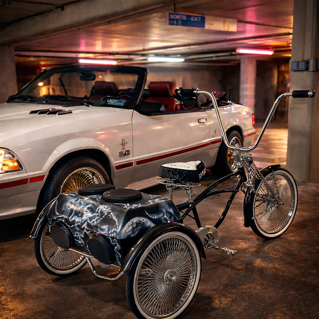 Choisir ce Tricycle Lowrider Custom, c’est assurer une signature visuelle exclusive. Il transforme n’importe quelle scène en décor premium : parfait en arrière-plan “statement”, en accessoire de scène, ou en sujet principal pour des plans iconiques.